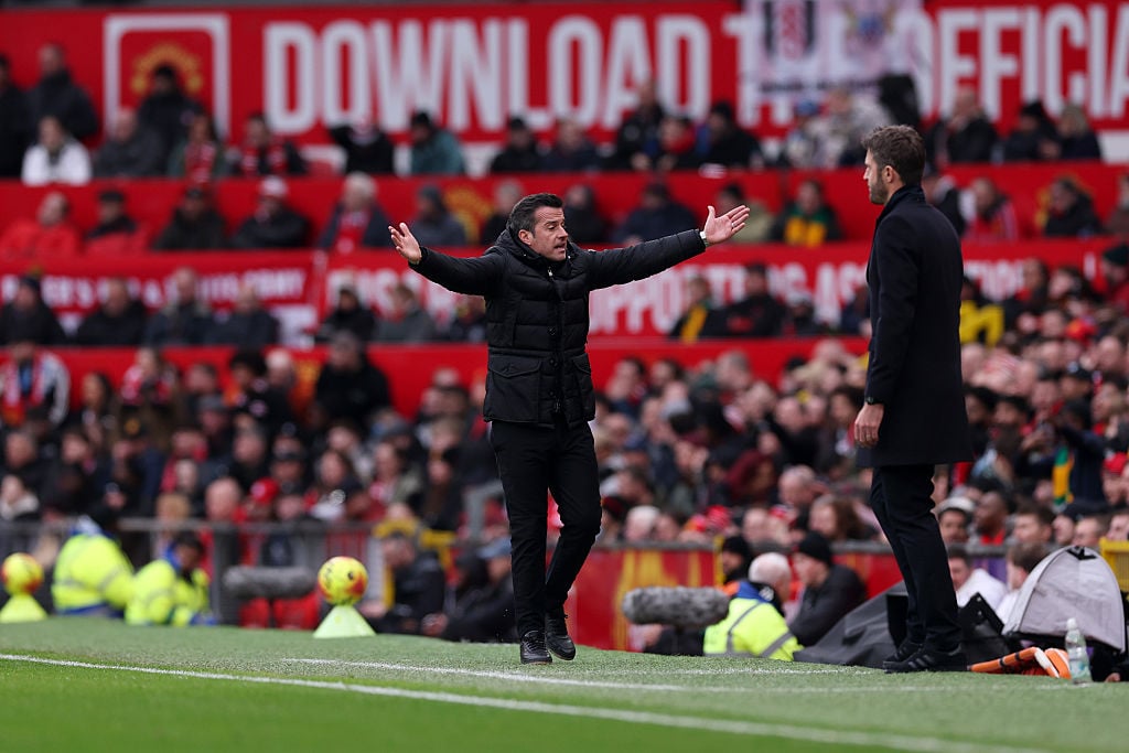 Marco Silva er ikke tilfreds, efter at Manchester United i forbindelse med målet til 1-0 fik et frispark på kanten af feltet.